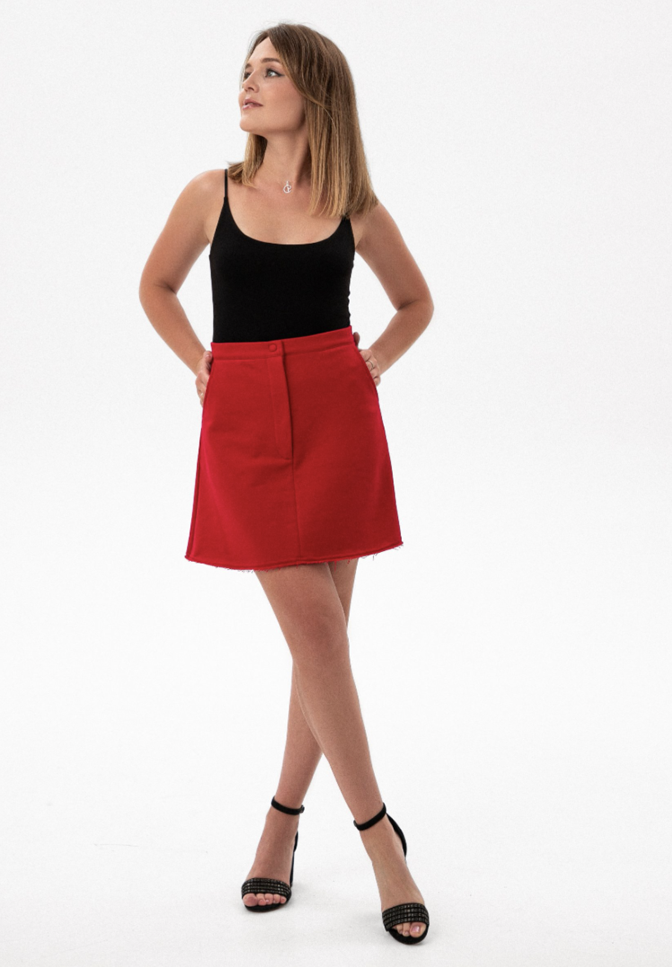 Юбка короткая, трапециевидного силуэта, среднего объёма. Спереди расположены два кармана с подрез-ным бочком, средний шов переходит в застёжку-гульфик. Сзади две талиевые вытачки. Верхний край обработан притачным поясом с застёжкой на одну пуговицу. Низ изделия обработан на плоскошовной машине (можно обработать швом двойной иглой), с открытым срезом.
